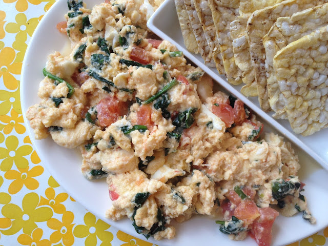 1. Heat frying pan and spray with olive oil, sauté spinach and tomatoes with garlic